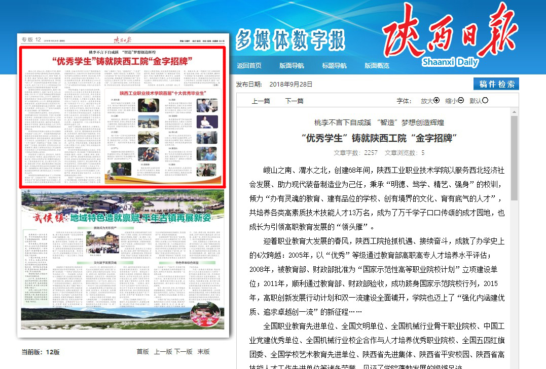 迎着职业教育大发展的春风,陕西工院抢抓机遇、接续奋斗,成就了办学史上的4次跨越:2005年,以“优秀”等级通过教育部高职高专人才培养水平评估;2008年,被教育部、财政部批准为“国家示范性高等职业院校计划”立项建设单位;2011年,顺利通过教育部、财政部验收,成功跻身国家示范院校行列,2015年,高职创新发展行动计划和双一流建设全面铺开,学院也迈上了“强化内涵建优质、追求卓越创一流”的新征程……