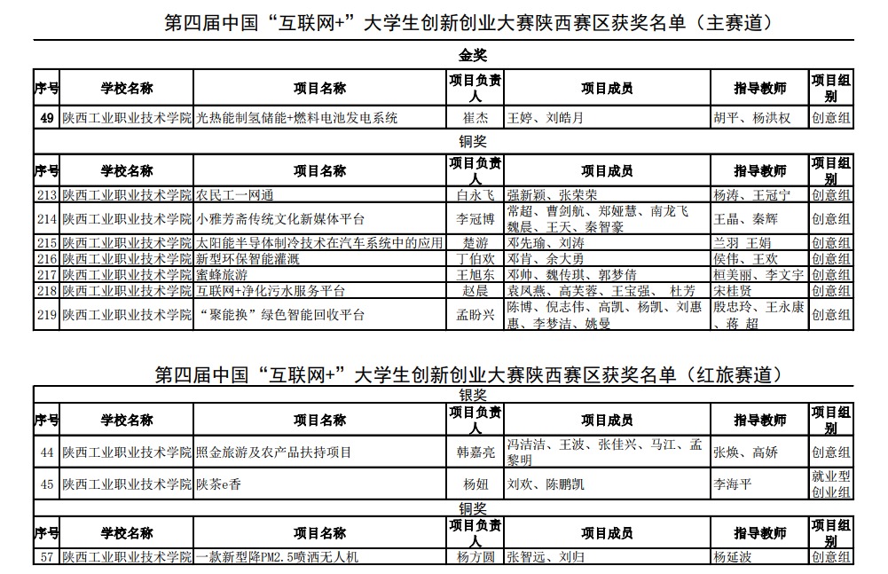 近日,第四届中国“互联网+”大学生创新创业大赛陕西赛区省级复赛结果公布,我院荣获第四届“互联网+”大学生创新创业大赛“青年红色筑梦之旅”赛道高校集体奖。还获得主赛道金奖1项、铜奖7项,红旅赛道银奖2项、铜奖1项。
