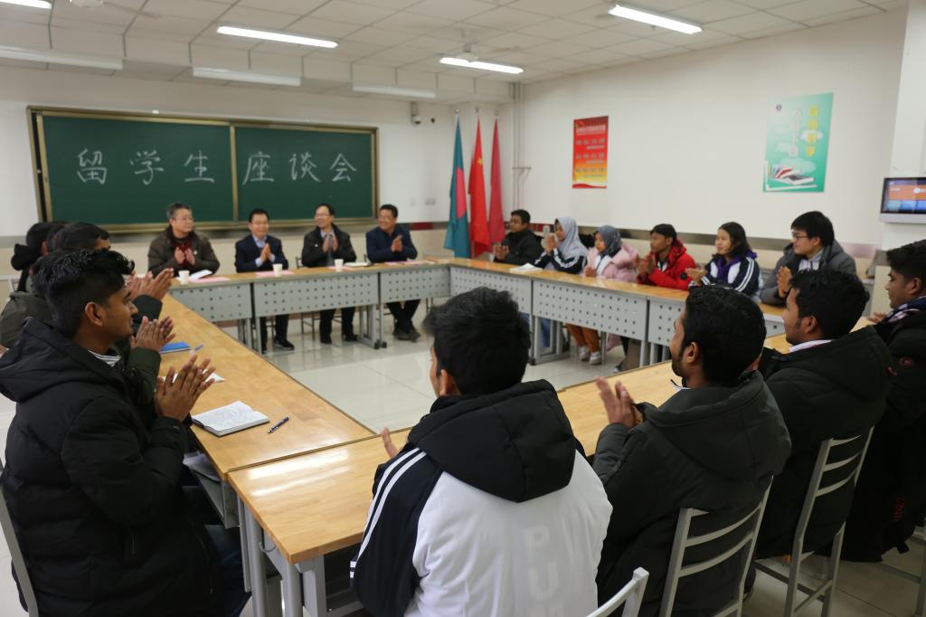 12月11日下午,我院留学生座谈会在崇明楼307教室召开,学院党委书记惠朝阳,国际合作与交流中心副主任秦景俊,工商管理学院党总支书记孙继龙、院长韩文飞出席会议,教师代表、留学生班主任以及全体留学生参加座谈会。