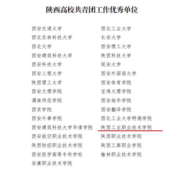近日,共青团陕西省委、中共陕西省委教育工委联合下发《关于2018年度陕西高校共青团工作考核结果的通报》【陕团联发〔2019〕9号】,我院荣获“2018年度陕西高校共青团工作优秀单位”,党委副书记、副院长刘永亮荣获“2018年陕西高校支持共青团工作好书记(校长)”称号,团委书记郝平荣获“2018年陕西高校共青团工作先进个人”称号。