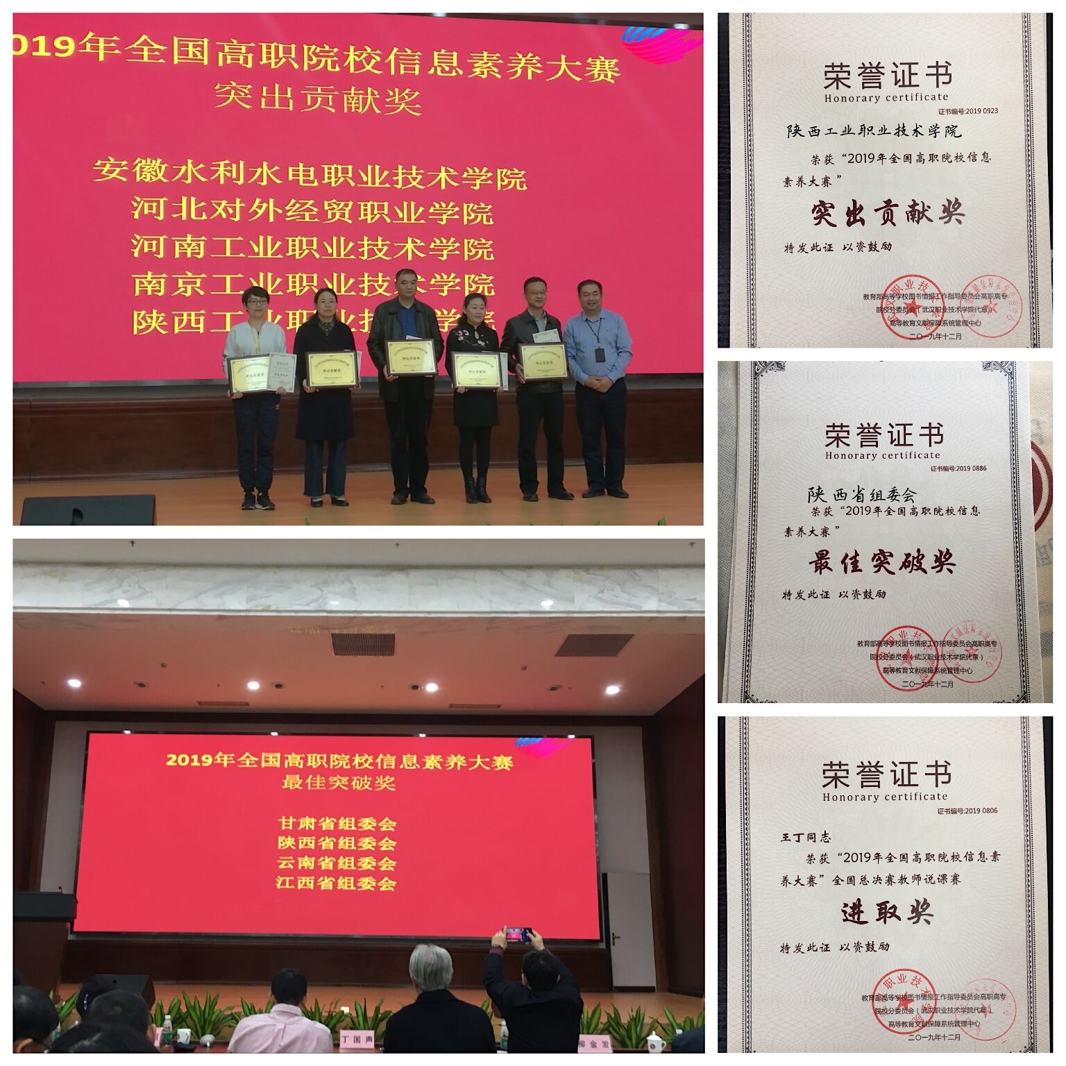 12月4日-5日,首届全国高职院校信息素养大赛全国总决赛开幕式在深圳职业技术学院举行。我院有力地筹备、组织陕西省赛,并在全国高职院校信息素养大赛的推进中起到了引领作用,荣获“突出贡献奖”。我院牵头成立的陕西省赛组委会,圆满完成大赛出题、组织比赛等工作,荣获“最佳突破奖”。我院图书馆王丁老师在全国总决赛教师说课赛中荣获“进取奖”。