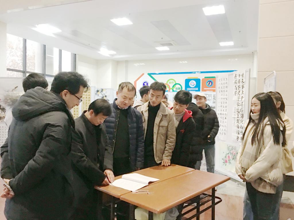 翰墨书风雅,丹青颂盛世。为了喜迎2020年新年,彰显学院美育特色,丰富校园文化生活,传承和发扬中国书画文化,展示我院学生多才多艺、健康向上的精神风貌,由我院学生工作部、美育部主办,大学生艺术团书画社承办的2019年笔书盛世墨绘芳华书画作品展在精艺楼大厅举行。学院党委副书记贺天柱、学工部部长郝军、美育部部长付胜利等亲临现场参观指导,贺天柱副书记对此次书画展给予了充分肯定,他表示,书画是中华传统文化,像这样的艺术活动惠及全院师生,要多举办多宣传,让更多的学生参与进来,以提升学生的人文素养,促进社会文明和谐。