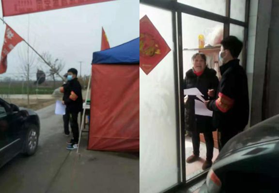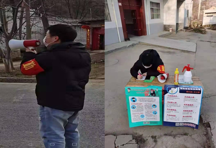 汽车工程学院冯情情同学,家住蓝田县三官庙镇过风岭村,和村里的“硬核”大爷们一起工作,变成村里的“拦路虎”,认真排查每一位进出人员,严格管控外来人员的流动,车辆登记,测量体温,跟着村里的工作人员挨家挨户发放防疫宣传单。