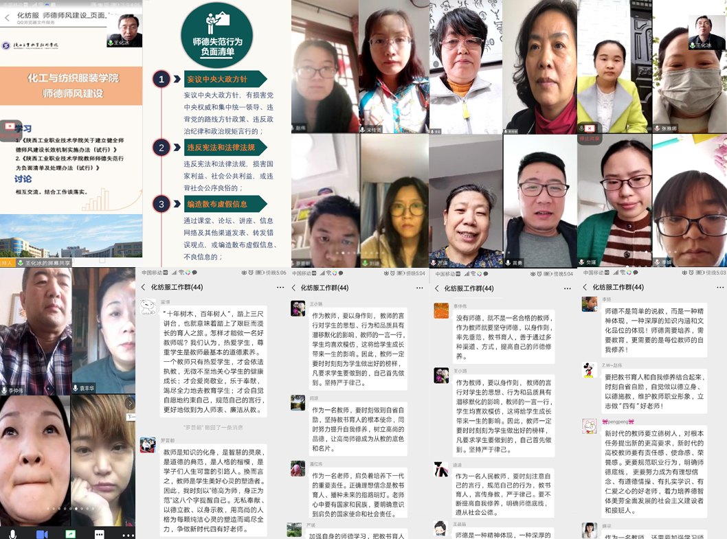 王化冰书记带领全体教师学习了《陕西工业职业技术学院关于建立健全师德师风建设长效机制实施办法(试行)》陕工院党字〔2020〕8号)、《陕西工业职业技术学院教师师德失范行为负面清单及处理办法》(陕工院党字〔2020〕13号)两个文件,对重点内容进行详细解读。王书记强调,师德是教师工作的职业底线,作为新时代的高职教师,坚决贯彻党和国家的教育方针,落实立德树人根本任务,要把坚持教书育人和自我修养相结合,严格遵守师德规范,做到以德立学、以德立身、以德施教,为人师表,关爱学生,用自己的专业特长培养学生的技能和职业素养,引导学生健康成长。化工与纺织服装学院院长贾格维对全体教师提出要求,认真贯彻两个文件精神,明确师德失范行为负面清单,时刻检查自己,不要触碰师德底线,严格自律,做好各项工作。