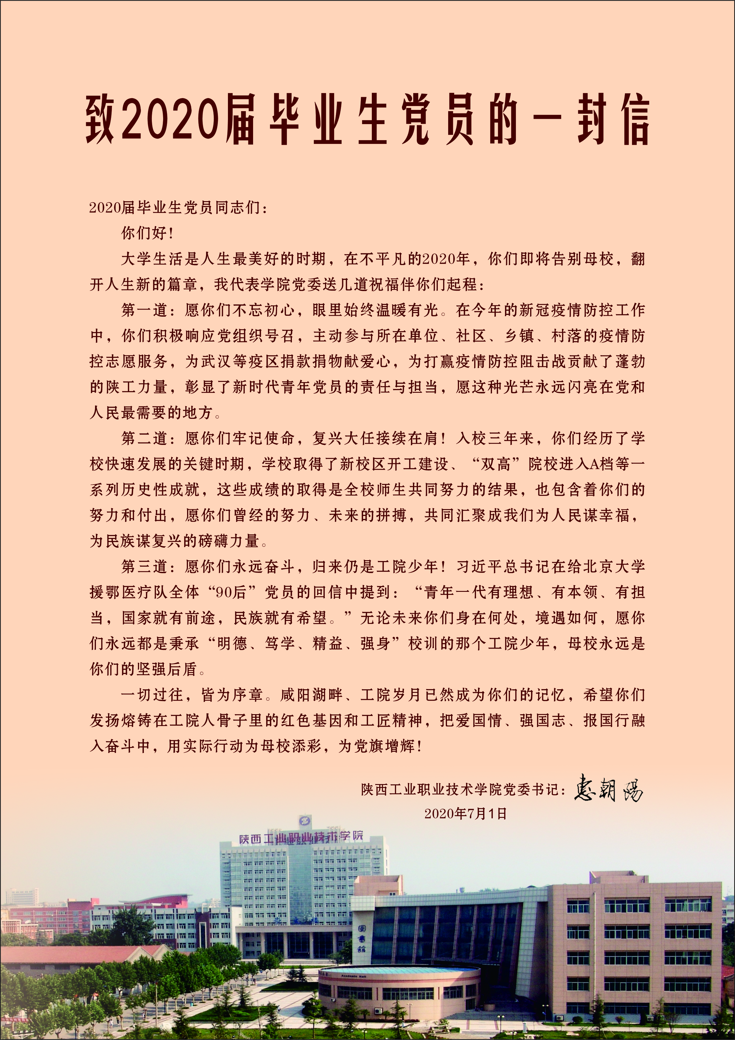 第一道:愿你们不忘初心,眼里始终温暖有光。在今年的新冠疫情防控工作中,你们积极响应党组织号召,主动参与所在单位、社区、乡镇、村落的疫情防控志愿服务,为武汉等疫区捐款捐物献爱心,为打赢疫情防控阻击战贡献了蓬勃的陕工力量,彰显了新时代青年党员的责任与担当,愿这种光芒永远闪亮在党和人民最需要的地方。
