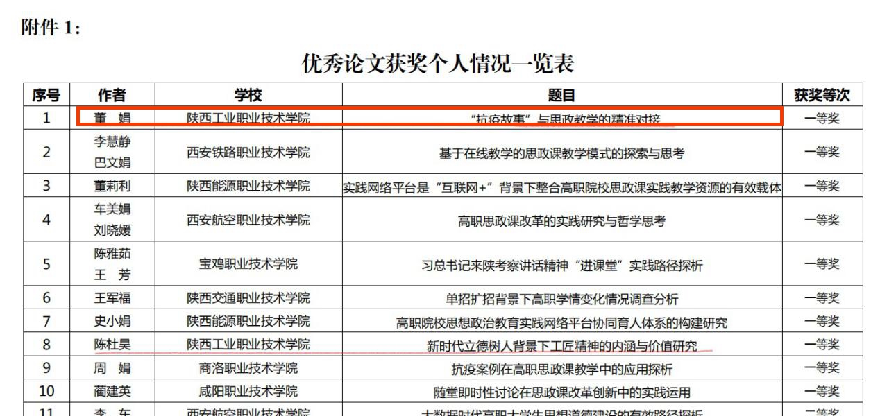 根据陕西省职教学会近日公布的思想政治理论课教育教学指导委员会征文评选结果,在“贯彻习近平来陕考察讲话精神,推进新时代高职思政课改革创新”主题征文活动中,我院马克思主义学院董娟老师的《“抗疫故事”与思政教学的精准对接》和陈杜昊老师的《新时代立德树人背景下工匠精神的内涵与价值研究》分别荣获主题征文活动一等奖;陈晨老师的《“互联网+思政教育”模式的创新和实践》和张娟老师的《职业素养教育嵌入高职院校思政课的探究》分别荣获二等奖;我院获评主题征文活动优秀组织奖。