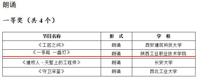 陕西省大学生艺术展演由省教育厅主办,每3年举办一届,是省内规格最高、规模最大、影响最广的大学生艺术赛事,也是陕西省为参加全国大学生艺术展演选拔节目的选拔赛。本届展演分为甲组(非专业组)和乙组,全省共有62所高校报名参赛,每所高校的艺术表演类节目仅限报送1个,我院大学生艺术团参加了表演类器乐、声乐、舞蹈、戏剧、朗诵全部5个类别的比赛。按照教育部文件相关要求,省教育厅决定向教育部推荐艺术表演类甲组(非专业组)作品16个、优秀案例10个,我院原创朗诵作品《一条路,一盏灯》、改编舞蹈《红船》2个艺术表演类作品和优秀案例《“化美育德,艺技融合”理念下高职美育课程改革的创新与实践——以陕西工业职业技术学院为例》被推荐至教育部代表陕西参加全国比赛,我院是省教育厅向教育部推荐的艺术表演类作品(甲组)和优秀案例中全省唯一一所高职院校。本届展演我院在获奖等次、获奖数量和获奖类别上均创学院历史新高。