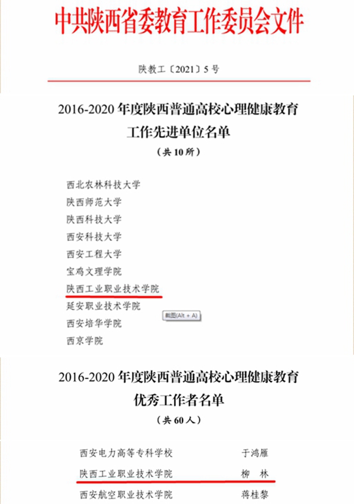 为贯彻落实《高等学校学生心理健康教育指导纲要》和《陕西普通高等学校学生心理健康教育工作建设规划(2016-2020年)》(陕高教生〔2015〕5号),大力培养选树新时代高校心理健康教育先进典型,省委教育工委开展了2016-2020年度陕西普通高校心理健康教育先进单位和优秀工作者评选表彰活动。我院荣获“2016-2020年度陕西普通高校心理健康教育工作先进单位”,我院心理咨询中心教师柳林荣获“2016-2020年度陕西普通高校心理健康教育优秀工作者”。