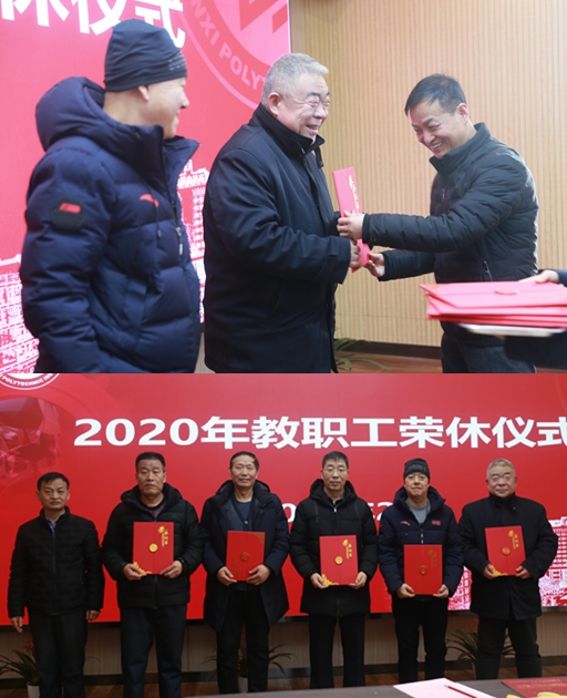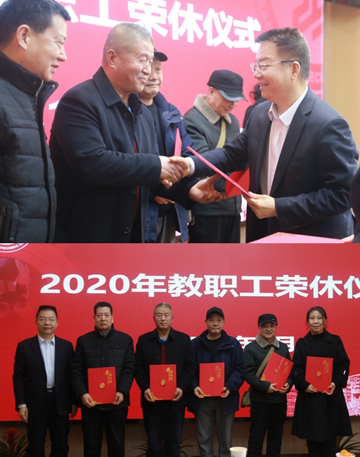 2月4日,我校首次教职工荣休仪式在崇文楼第一会议室举行。学院党委书记惠朝阳、院长刘永亮、党委副书记贺天柱出席了本次仪式,并为到场的荣休教职工颁发证书和纪念品。2020年度退休教职工以及党委组织部、工会、离退休工作处等部门负责人共同见证了这一隆重的时刻,人事处处长殷锋社主持仪式。