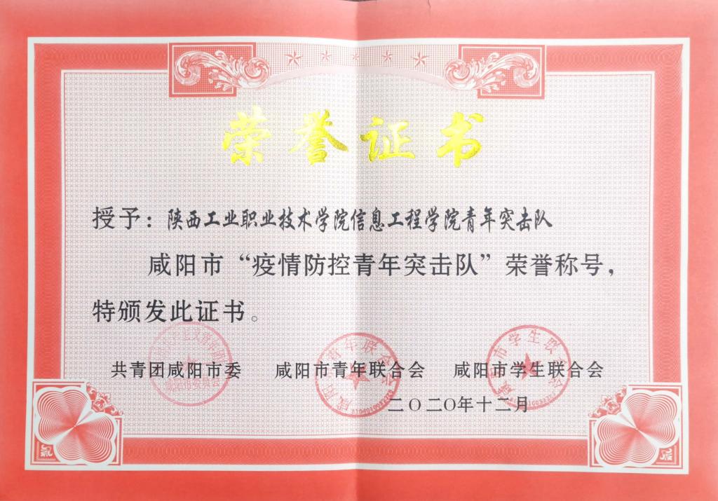 为更好地激励广大团员青年服务疫情防控工作,贡献青春智慧和力量,近日共青团咸阳市委下发文件,对新冠疫情发生以来,挺身而出、冲锋在前,充分展现青年生力军和突击队作用的全市各级团组织和青年志愿者进行表彰,信息工程学院团总支荣获市级“疫情防控青年突击队”荣誉称号。
