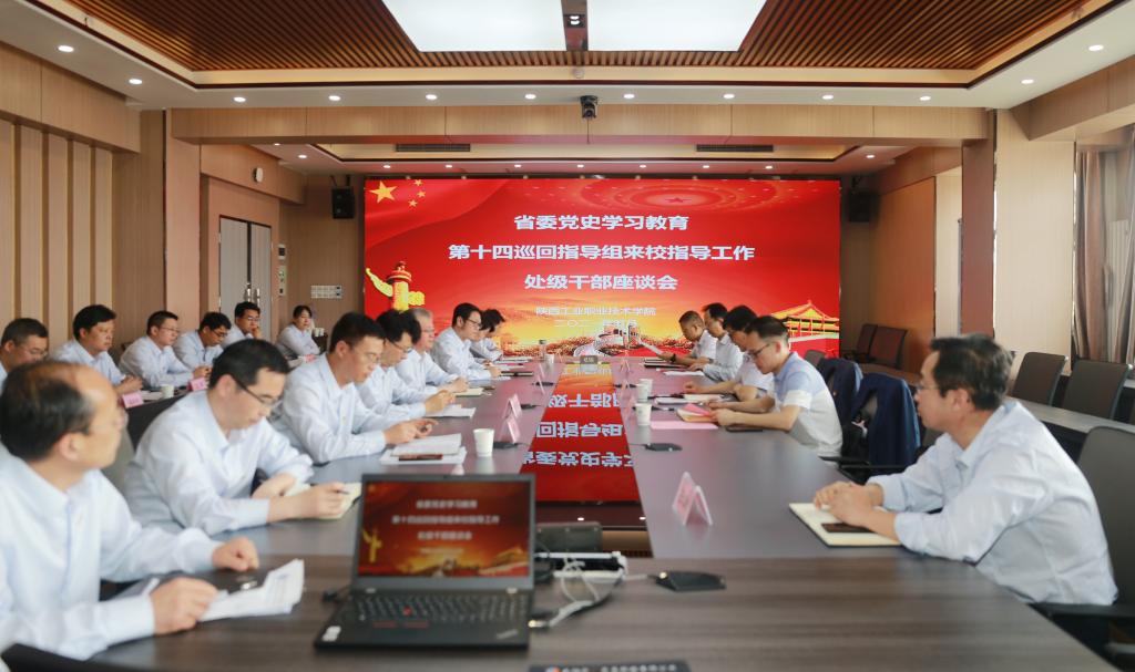 5月12日上午,省委党史学习教育第十四巡回指导组组长刘江南,副组长李四军,成员王凌云、郝建武、加婷婷、曹远、高仪铎一行莅临陕西工业职业技术学院,对我校党史学习教育的开展情况进行巡查、指导,并召开调研座谈会。学校党史学习教育领导小组组长、党委书记惠朝阳,党委副书记、纪委书记康强,党委副书记贺天柱、田昊,以及我校党史学习教育领导小组全体成员,相关部门及二级学院党组织负责人,部分师生代表参与本次巡回指导组来校检查相关工作。田昊同志主持巡回指导组检查工作汇报会。