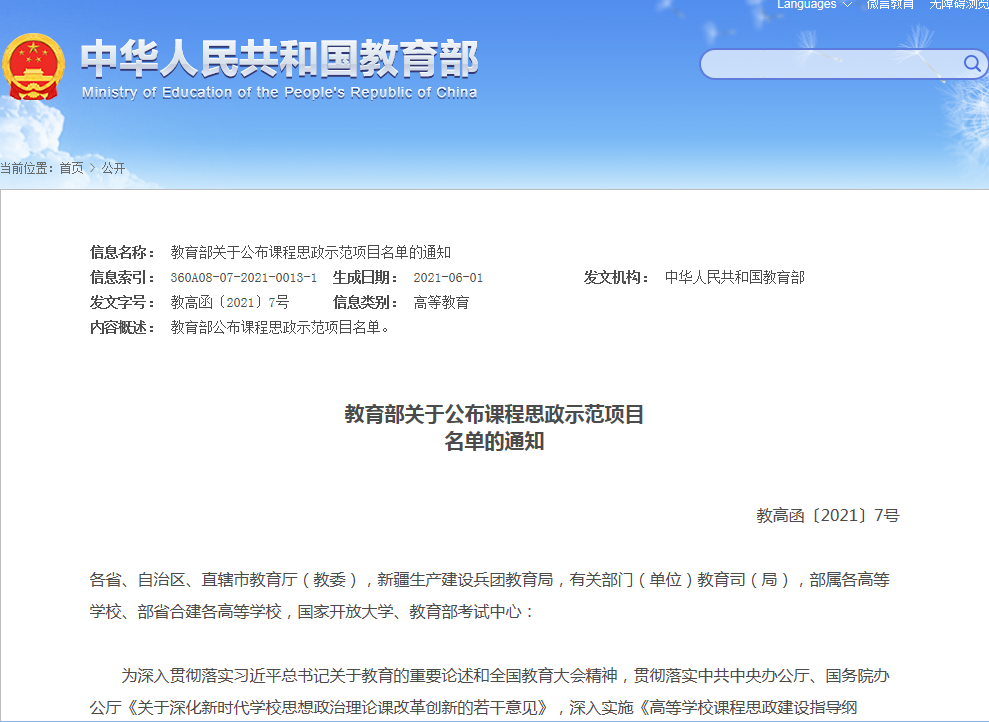 此次是教育部开展的首批课程思政示范建设项目,经组织推荐、专家遴选、会议评议和网络公示等,确定普通本科教育、研究生教育、职业教育、继续教育课程思政示范课程699门、课程思政教学名师和团队699个、课程思政教学研究示范中心30个。