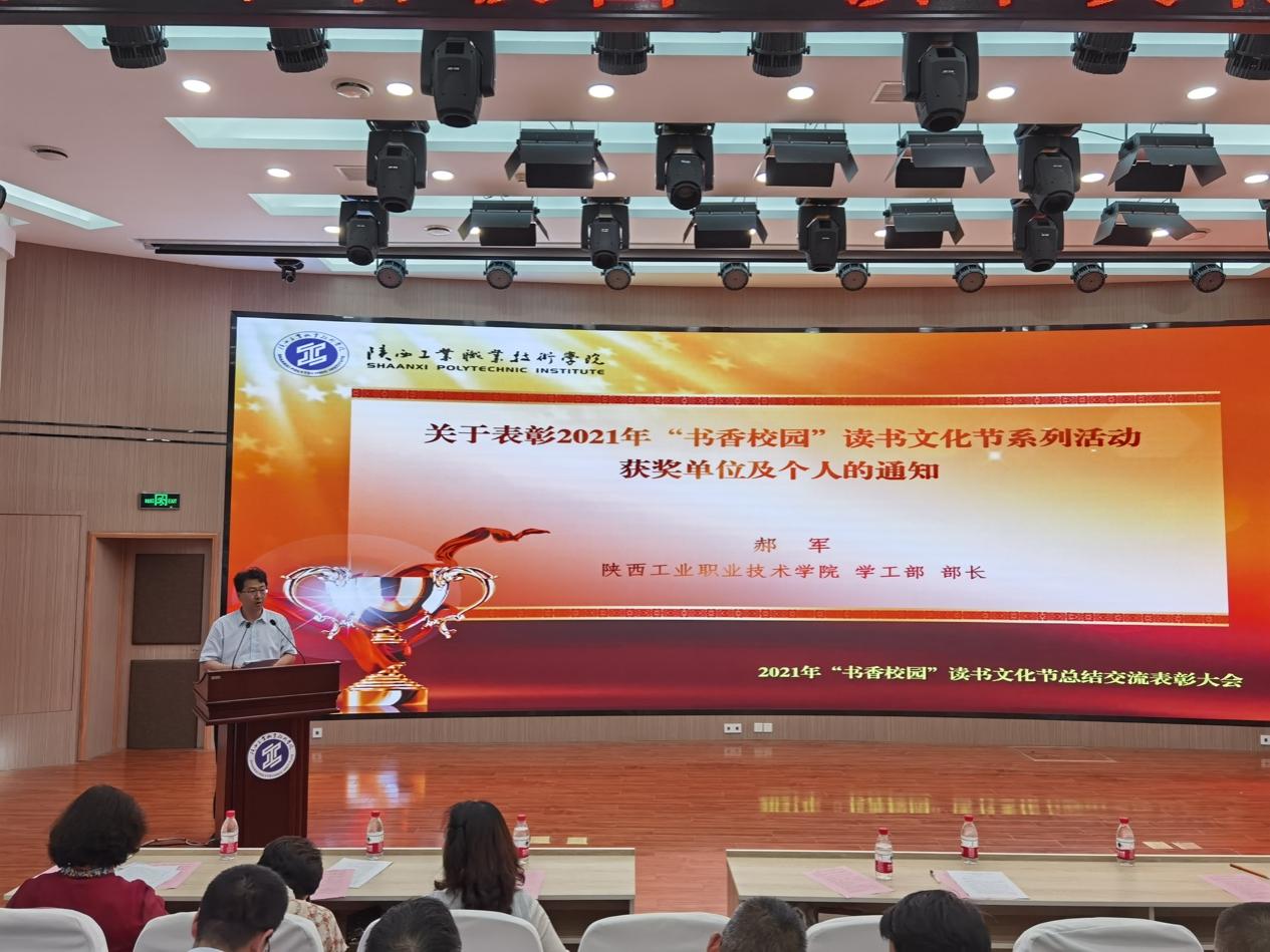 学工部部长、学生处处长郝军宣读《关于表彰2021年“书香校园”读书文化节系列活动获奖单位及个人的通知》。