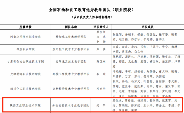 尚华,分析检验技术专业教学团队带头人,二级教授,化学检验工高级技师、国家技能竞赛裁判,全国模范教师,享受国务院政府津贴专家,全国第六届黄炎培职业教育杰出教师,陕西“高层次人才特支计划”领军人才-教学名师。