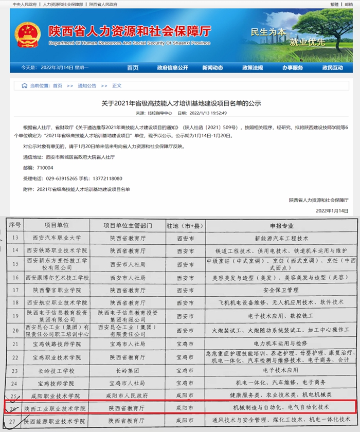 近日,陕西省人力资源和社会保障厅公示了2021年省级高技能人才培训基地建设项目名单,我校入选“2021年省级高技能人才培训基地”建设项目单位。