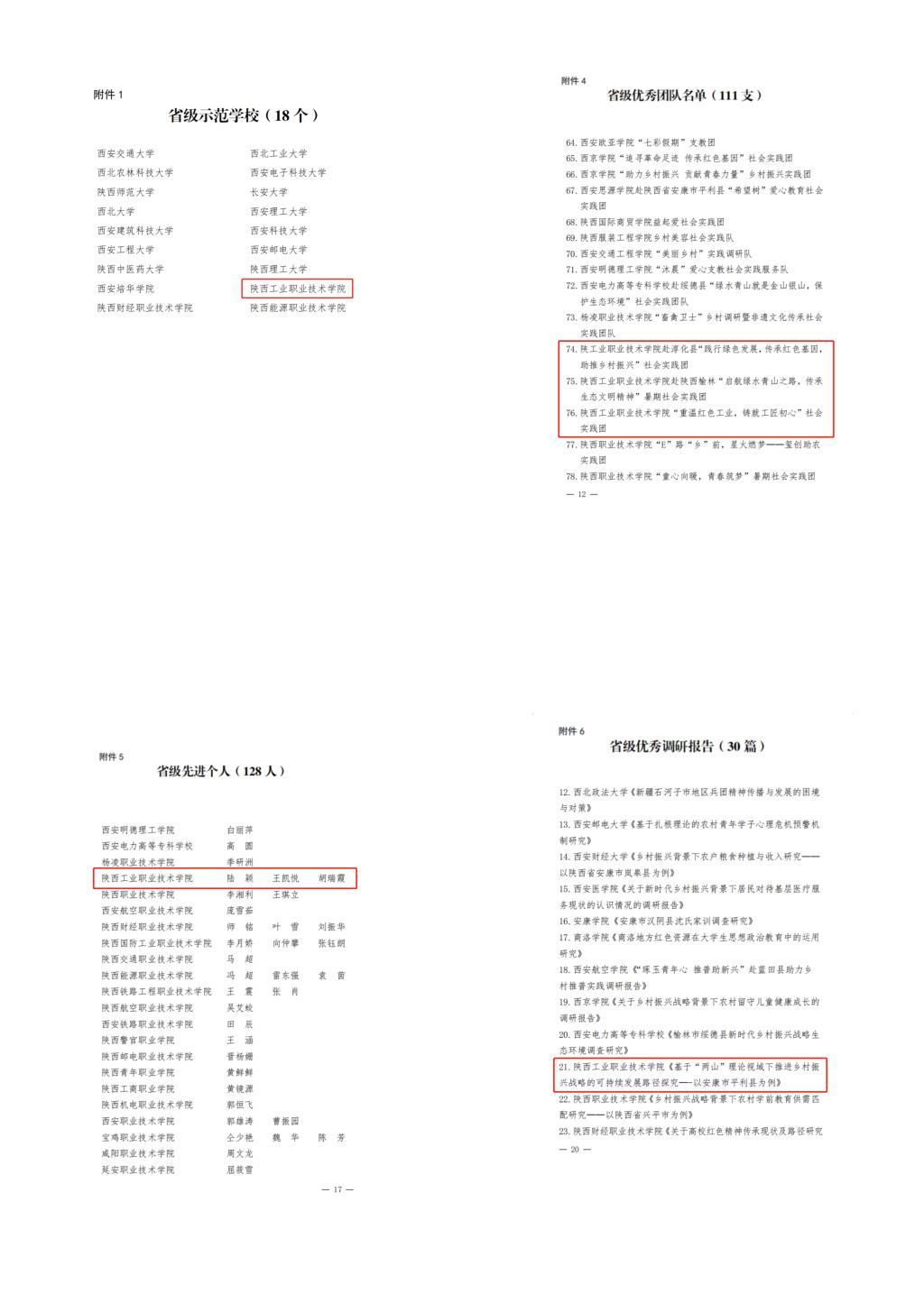 近日,中共陕西省委宣传部、中共陕西省委文明办、中共陕西省委教育工委、共青团陕西省委、陕西省学生联合会联合下发《关于2022年陕西省大中专学生志愿者暑期文化科技卫生“三下乡”社会实践活动先进集体、先进个人的通报》,我校荣获“省级示范学校”荣誉称号,陕西工业职业技术学院赴淳化县“践行绿色发展,传承红色基因,助推乡村振兴”社会实践团、陕西工业职业技术学院赴陕西榆林“启航绿水青山之路,传承生态文明精神”暑期社会实践团、陕西工业职业技术学院“重温红色工业,铸就工匠初心”社会实践团荣获“省级优秀团队”荣誉称号;马克思主义学院教师陆颖、机械工程学院辅导员王凯悦、材料工程学院辅导员胡瑞霞荣获“省级先进个人”荣誉称号;材料工程学院《基于“两山”理论视域下推进乡村振兴战略的可持续发展路径探究—-以安康市平利县为例》荣获“省级优秀调研报告”。