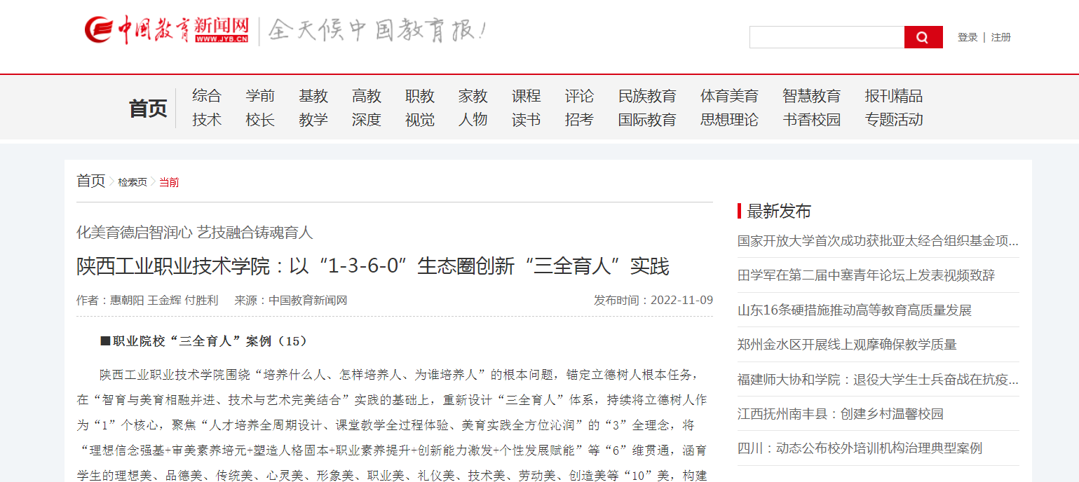 近日,中国教育新闻网精选出24所职业院校“三全育人”典型案例面向全国宣传推广,我校《陕西工业职业学院:以“1-3-6-0”生态圈创新“三全育人”实践》成功入选。