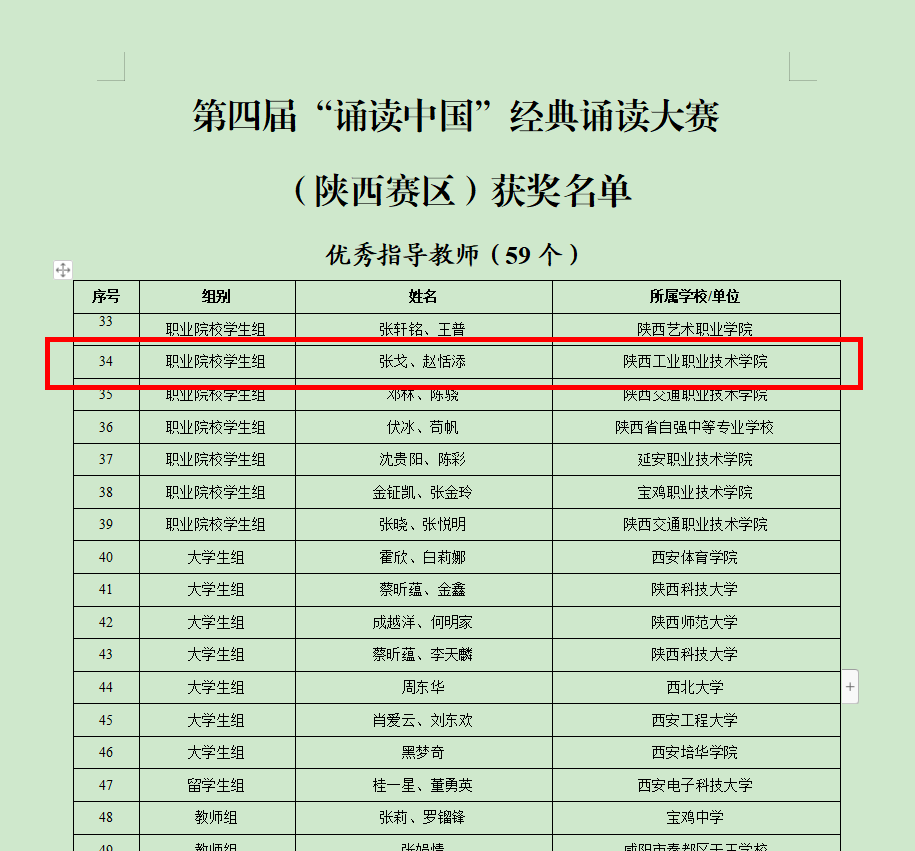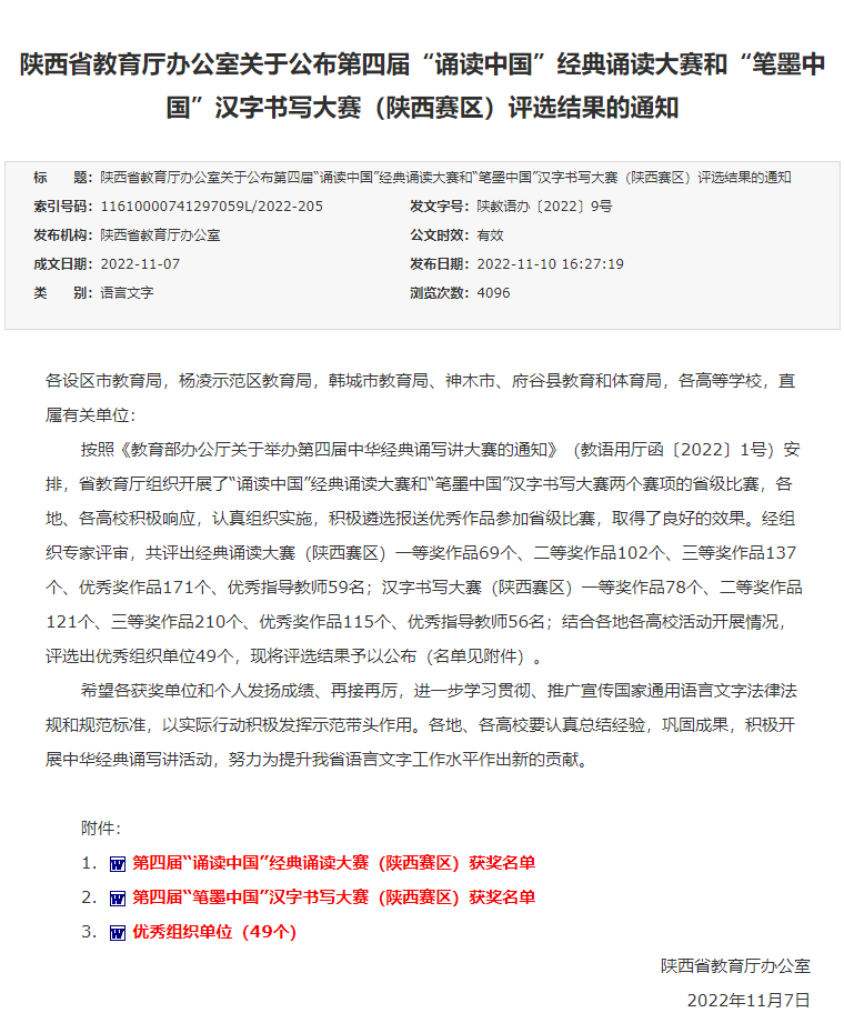 近日,陕西省教育厅办公室公布了第四届“诵读中国”经典诵读大赛和“笔墨中国”汉字书写大赛(陕西赛区)评选结果,我校大学生艺术团上报的朗诵作品《路标与灯盏》荣获一等奖,书法作品荣获三等奖,美育部教师张戈、赵恬添荣获优秀指导教师奖。