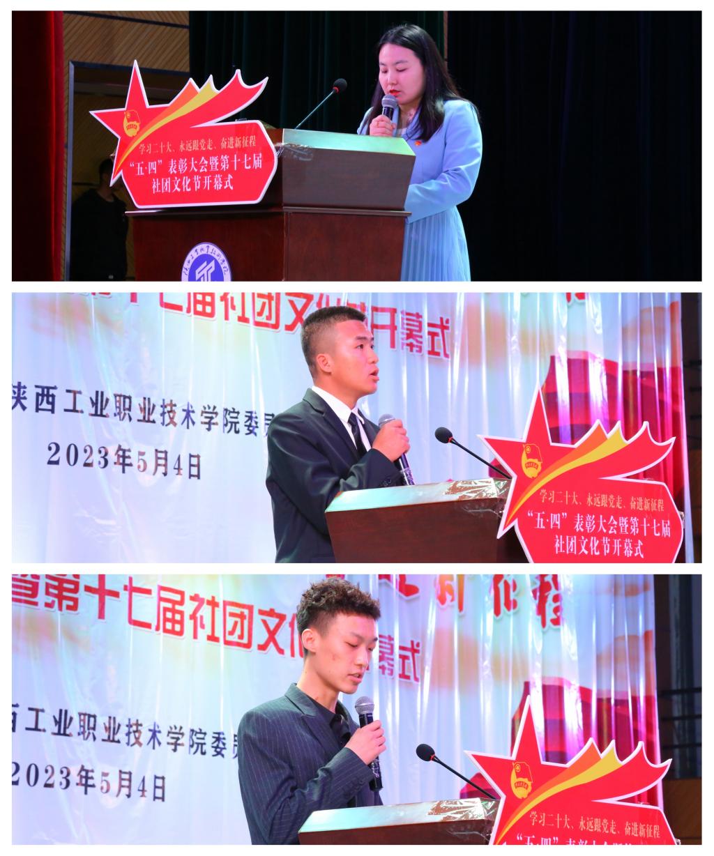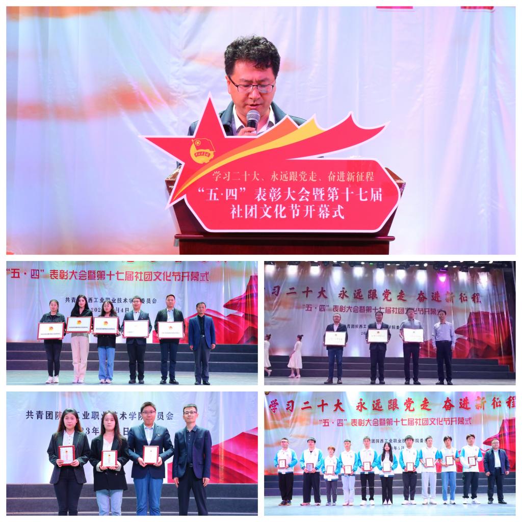 大会在庄严的国歌声中拉开帷幕。党委学工部部长、学生处处长郝军宣读了《关于表彰2022-2023 学年陕西工业职业技术学院共青团先进集体、先进个人的决定》,随后领导嘉宾分别为全省高校团建示范单位培育创建单位、五四红旗团总支、五四红旗学生会、优秀学生社团、五四红旗团支部、优秀教师团干部、优秀学生团干部、优秀团员、青春榜样、优秀志愿者的获奖集体代表和个人颁发奖牌和获奖证书。
