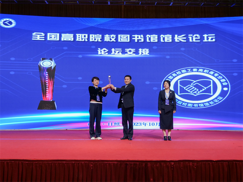 会上,全国高职院校图书馆馆长论坛主席、教育部高校图工委高职分委会副主任、哈尔滨开放大学党委书记刘建国,将“论坛杯”移交给我校,预示着学校将正式成为2024年馆长论坛承办单位。
