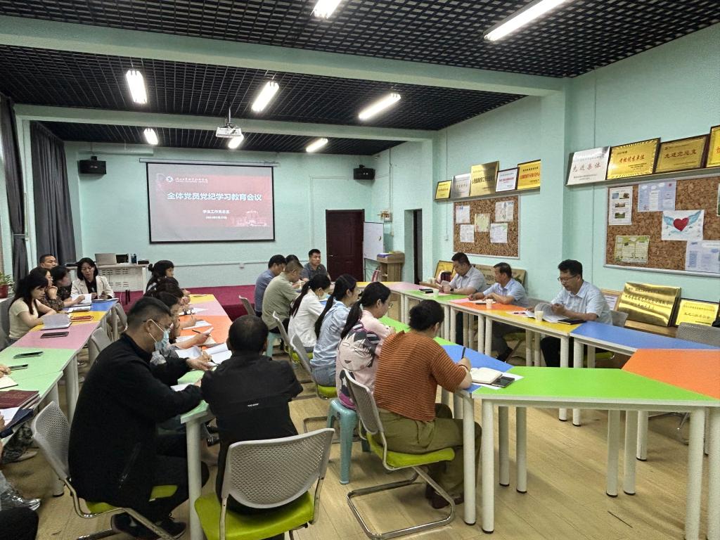 按照学院《中共陕西工业职业技术学院委员会党纪学习教育实施方案》安排部署,5月29日,学生工作党总支在格物楼一楼大学生思想政治教育温馨港召开了党纪学习教育专题会,总支全体党员参加学习,党委副书记贺天柱,党委委员、副院长段峻参加了会议。会议由党总支书记郝军主持。