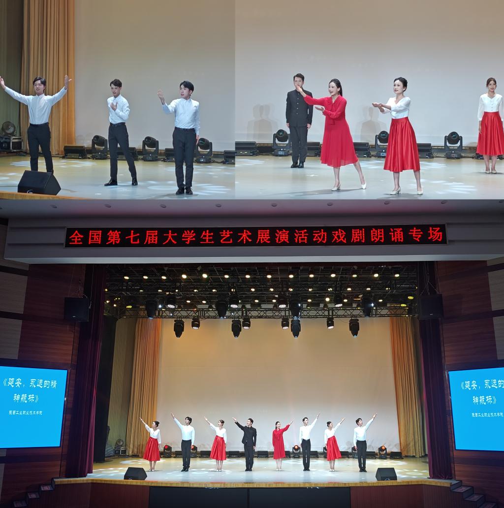 6月13日晚,我校原创朗诵作品《延安,永远的精神航标》在朗诵专场中精彩亮相,与来自全国各地的30所高校同台竞演,荣获艺术表演类一等奖,优秀创作奖。《延安,永远的精神航标》由我校客座教授杨焕亭老师精心创作,以讴歌延安精神为主题,用情真意切的语言描绘出延安的峥嵘岁月图景,引导广大青年坚定理想、胸怀家国、奋力筑梦;展演现场,同学们以饱满的热情和精彩的演技,展现了我校学子的文化素养和青春风采。演出前,学校党委副书记贺天柱到现场看望了参演师生,对老师和同学们的辛苦付出给与了肯定与鼓励。