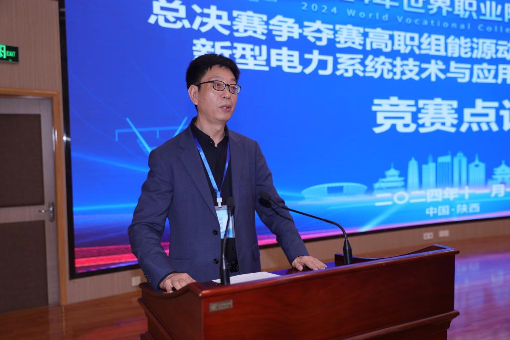 闭赛式现场,新型电力系统技术与应用赛项裁判长宋奇吼作赛事技术点评和裁判工作总结,中共陕西省委教育工作委员会、陕西省教育厅二级巡视员高巍,陕西省教育厅职业教育与成人教育处副处长周杰,陕西工业职业技术学院党委副书记、校长刘永亮,陕西工业职业技术学院副校长梅创社出席闭赛式并为获奖选手颁奖。