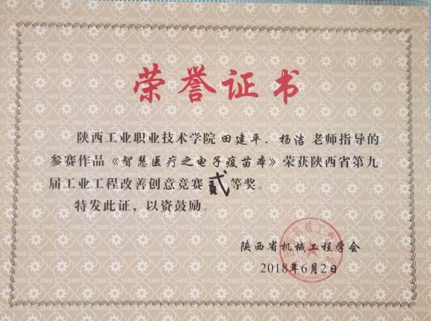 由陕西省机械工程学会主办,陕西省机械工程学会工业工程与管理分会协办、陕西科技大学承办的 “陕西省九届工业工程改善创意竞赛”决赛于6月2日在陕西科技大学举行,共有省内外20所院校和企事业单位代表参赛。本次竞赛历时3个月,先后经历竞赛启动、竞赛宣讲、校内初赛、校内决赛、省内网评、决赛答辩等6个环节,最终从77项参赛作品中评选出前30强进入决赛答辩环节。由我院工商管理学院教师田建平、杨洁指导,工商1601班张静、刘香汐、赵佩宁制作的参赛作品“智慧医疗之电子疫苗本”荣获二等奖。