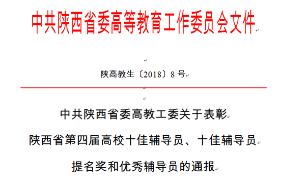 近日,省委高教工委下发文件(陕高教生〔2018〕8号),对陕西省第四届高校十佳辅导员、十佳辅导员提名奖和优秀辅导员进行通报表彰,我院辅导员韩二豹、魏蕾同志荣获“陕西省第四届高校优秀辅导员”称号。