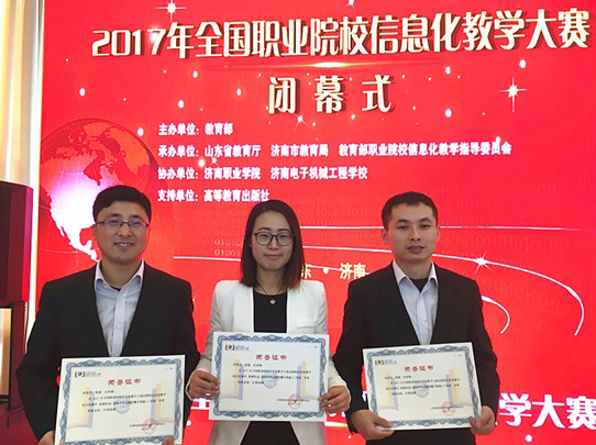 11月25至27日,2017年全国职业院校信息化教学大赛决赛在山东济南举行,我院土木工程学院教师侯艳芳、张超、安亚强团队创作的教学作品《落地扣件式钢管脚手架施工》在高职组信息化教学设计比赛中获得全国二等奖。