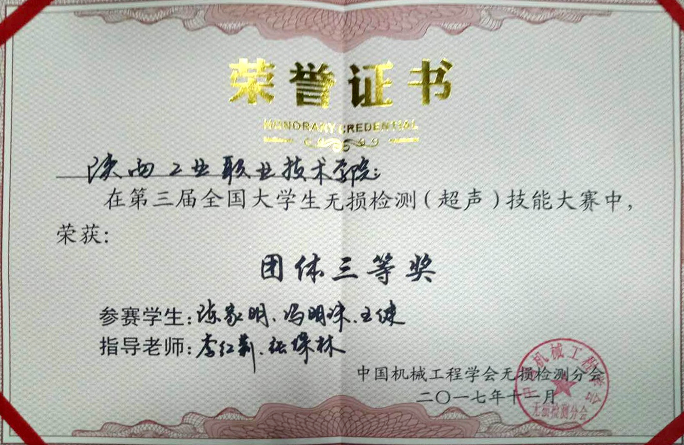 11月18日,由中国机械工程学会无损检测分会主办的第三届全国大学生无损检测(超声)技能大赛在南昌举行,共有来自全国26所本科和高职院校的78名选手参加了比赛。经过理论知识和实操技能的激烈角逐,我院材料工程学院教师李红莉、张保林指导的冯明珠、王健、陈家明3名同学荣获团体三等奖1项和个人三等奖3项。