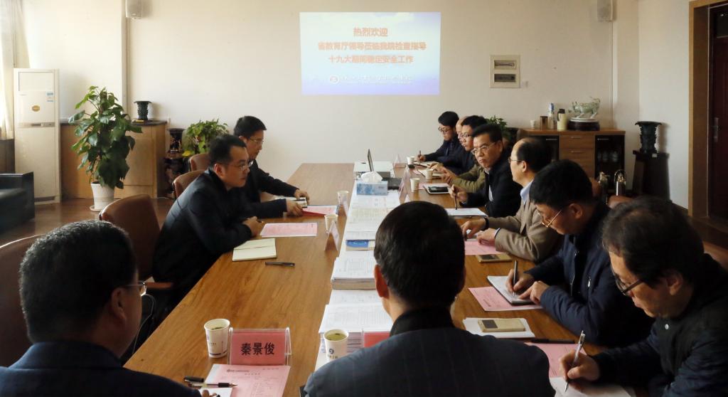 10月12日,省教育厅学生处副调研员白炀一行来我院督查十九大期间校园稳定安全工作。党委副书记、副院长刘永亮汇报了我院近期稳定安全工作,党政办(稳定办)、宣传部、学工部(学生处)、后勤处、保卫处、教务处、团委等部门负责人参加了汇报会。