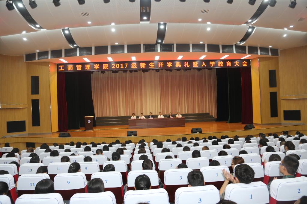 9月7日上午,工商管理学院在明德堂举行2017级新生开学典礼暨入学教育大会,工商学院党总支书记孙继龙、院长韩文飞、副院长吴姗娜参加了会议。韩文飞院长致欢迎词,他首先代表工商学院全体师生向2017级新同学的到来表示热烈欢迎,然后详细介绍了工商学院的基本情况、机构设置、发展历程及教学成果,并向新生提出三点希望和要求:一是尽快适应校园生活环境,增强独立生活能力;二是尽快适应校园学习环境,增强自主学习能力;三是尽快了解所学专业,树立坚定的专业思想,认真学习,为毕业后走向社会奠定工作基础。