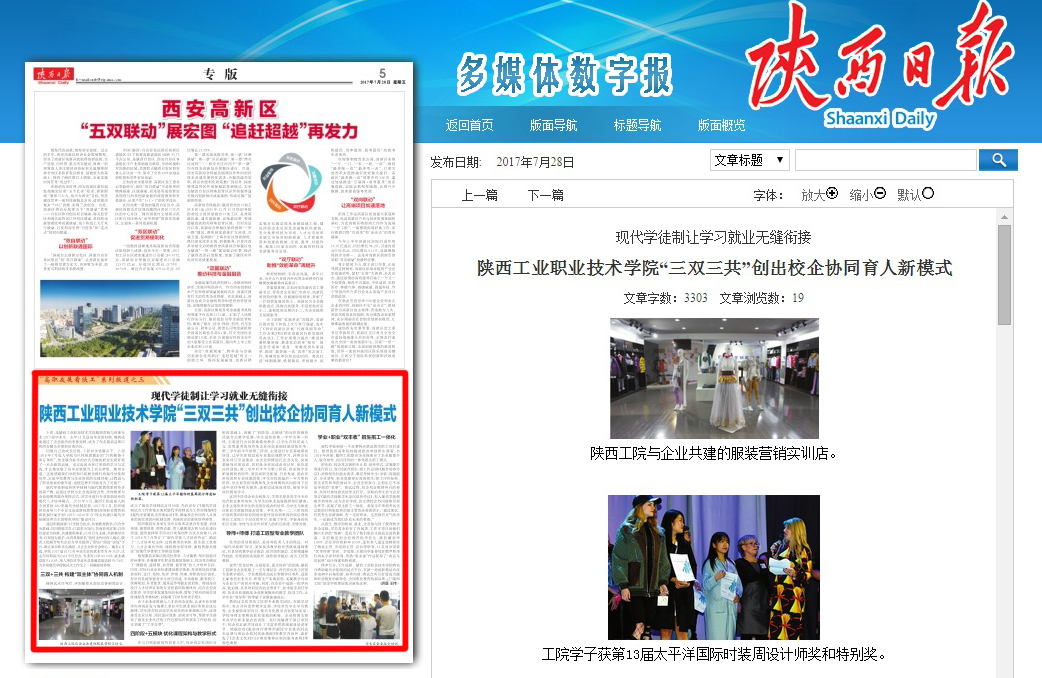 7月28日,《陕西日报》继续刊发“高职发展看陕工”系列报道的第三篇,以《现代学徒制让学习就业无缝衔接——陕西工业职业技术学院“三双三共”创出校企协同育人新模式》为题专版聚焦我院推进现代学徒制试点工作。全文如下: