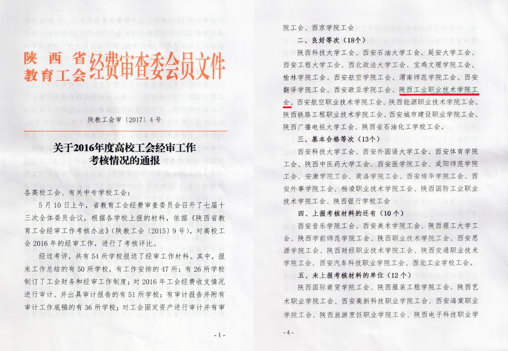在日前结束的全省高校工会干部培训班上,陕西省教育工会经审委员会对全省54所院校2016年经审工作考评结果进行了通报,我院工会荣获“2016年度陕西省高校工会经审工作考核良好”等次,受到省教育工会发文表彰和点名表扬,这已是我院工会经审工作连续六年受到省教育工会通报表彰。据了解,全省仅有四所高职院校工会获得年度经审工作考核良好等次。