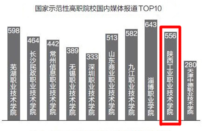 6月13日,《中国教育报》在其第9版刊发了题为《看百所示范高职,谁更声名远播》的专题文章,对中国传媒大学高教传播与舆情监测研究中心联合人民日报《民生周刊》发布的“百所国家示范性高职院校媒体传播力报告”进行解读。在该中心去年11月发布的“全国百所示范性高职院校影响力排行榜”中,我院位列全国第13名,也是陕西省唯一入围前15强的高职院校。同时,在其最新公布的“国家示范性高职院校国内媒体报道TOP10”子榜中,我院以556分位列全国第九,陕西省第一。