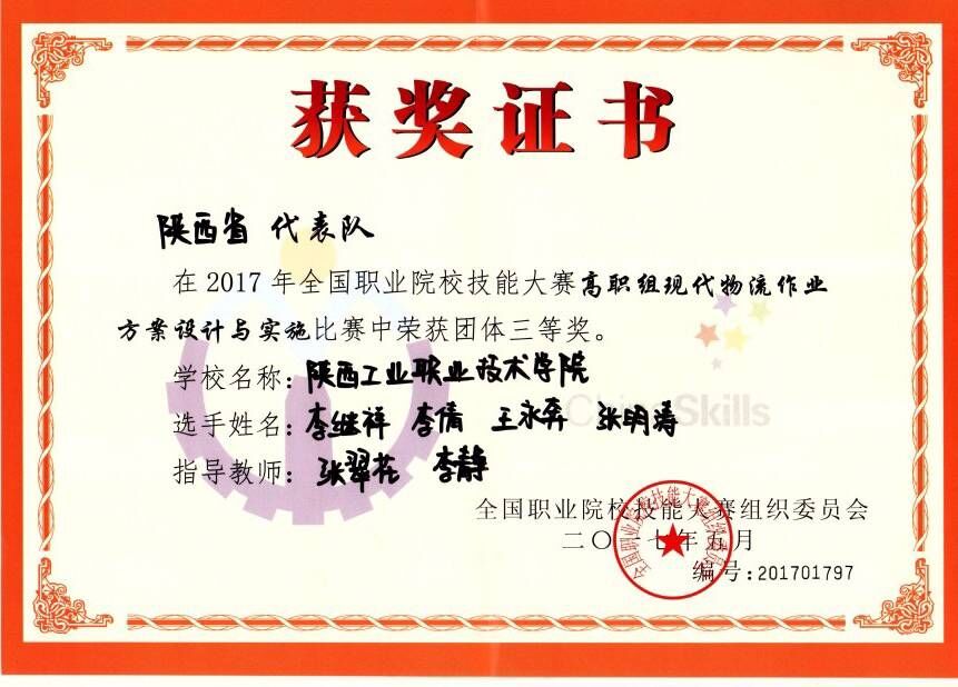 5月12日至14日,为期三天的2017年全国职业院校技能大赛高职组现代物流作业方案设计与实施比赛在天津举行。本次大赛共有来自全国30个省市自治区的59所院校、236名参赛选手参加。经过三天的激烈比拼,由我院物流管理学院张翠花、李静老师指导,物流1501班李倩、物流1502班张明涛、王永奔、物流1506班李继祥四名同学组成的团队,荣获该赛项团体三等奖,这也是我院首次在该赛项获得国赛大奖。