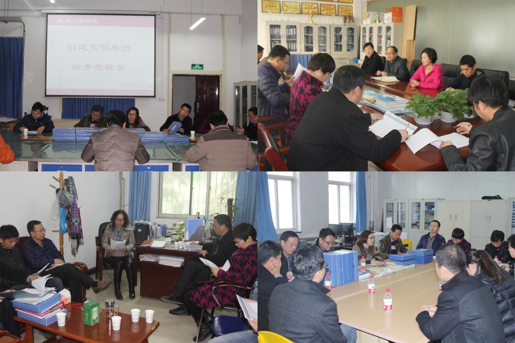 12月15日,由宣传部、党政办、组织部、学工部、工会、后勤处、离退处、保卫处等部门人员组成的文明单位考核验收小组,对2016年申报创建“文明单位”的机械工程学院、土木工程学院、思政部、财务处进行了考核验收。
