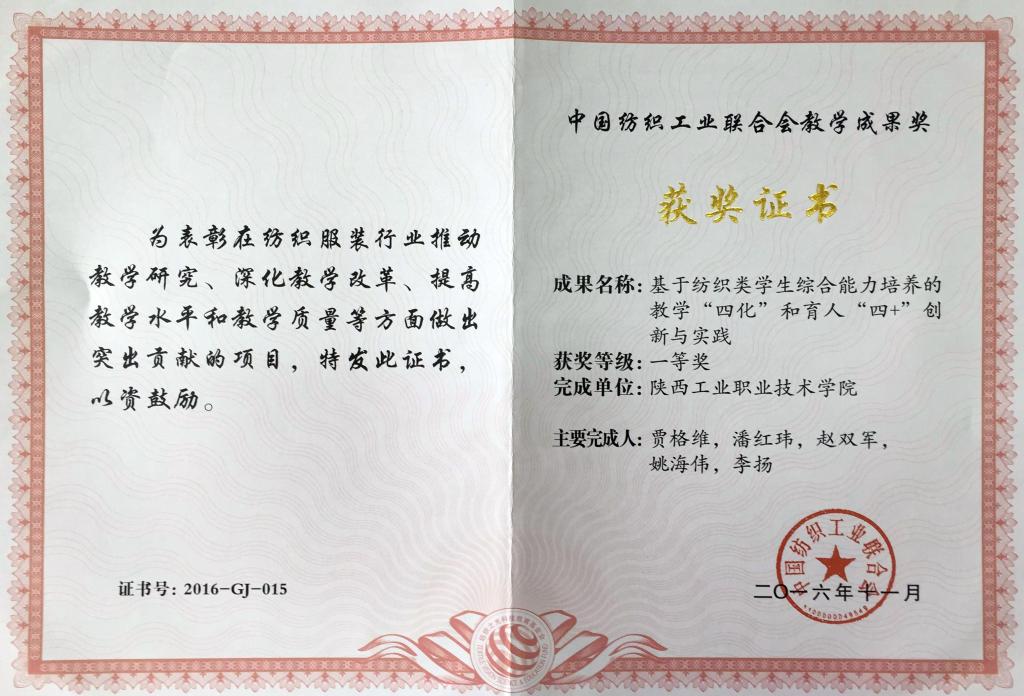 据悉,中国纺织工业联合会纺织教育教学成果奖每两年评选一次,主要集中在人才培养模式探索与实践、课程体系建设、教学方法与模式改革、学生能力培养、实践性教学等方面,2016年共有授奖项目101项,其中一等奖17项,二等奖32项,三等奖52项。我院贾格维、潘红玮、赵双军、姚海伟、李扬的“基于纺织类学生综合能力培养的教学‘四化’和育人‘四+’创新与实践”荣获一等奖;王显方、杨小侠、姚海伟、赵伟的“纺纱设备拆装与维护课程改革实践”和严瑛、康强、王化冰的“‘教学做一体’纺织类实训教学的创新与实践”分获二等奖。