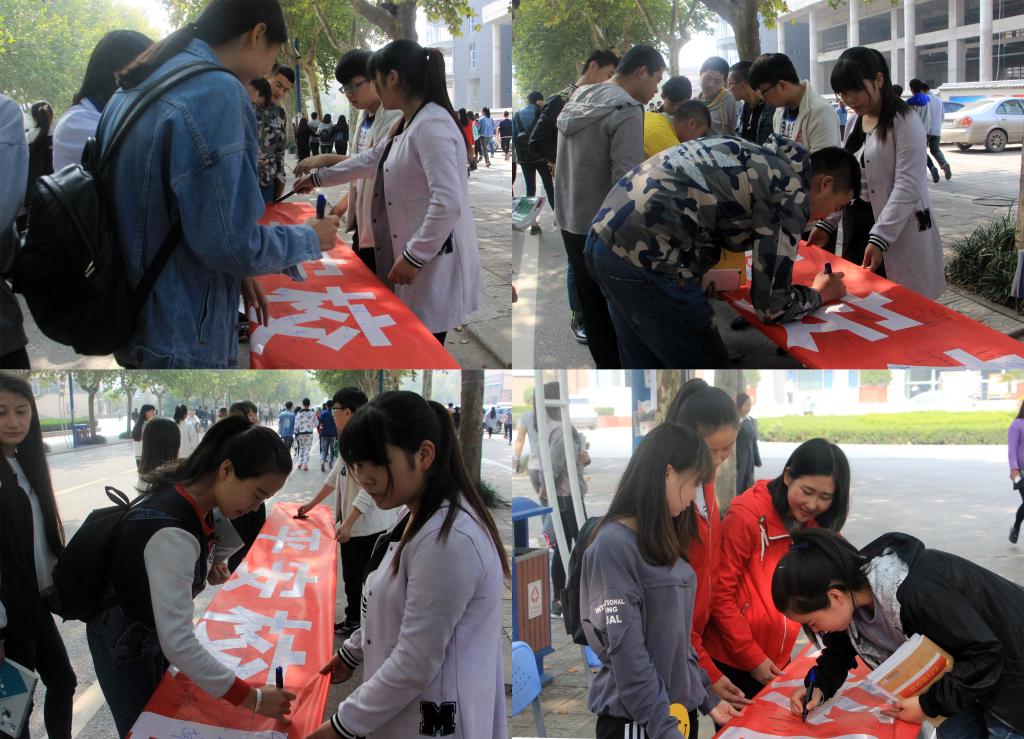 10月18日,团委在成才大道开展以“平安校园共担当,和谐校园共分享”为主题的签名活动。参加活动的同学纷纷表示,在以后的学习生活中要自觉遵守学校的各项规章制度,积极预防和消除安全隐患,从身边点滴小事做起,为创建平安校园的工作尽到自己一份责任。