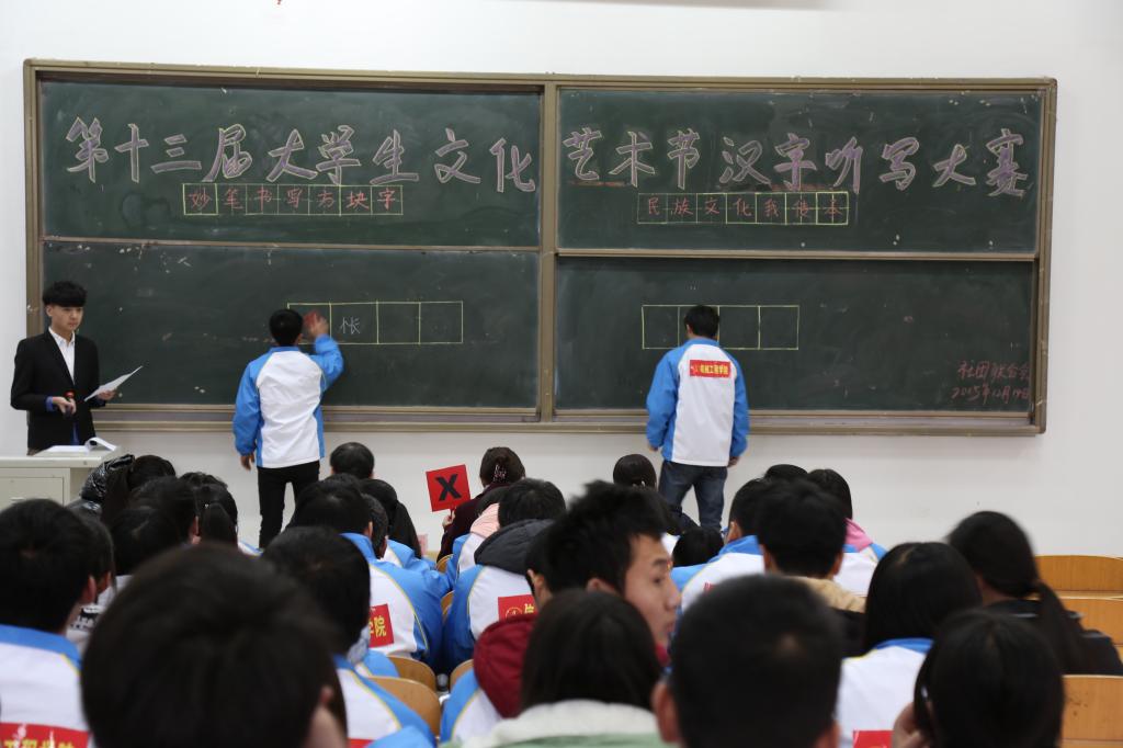 聆听华夏之声,书写汉字之美。12月14日下午四点半,我院第13届大学生文化艺术节汉字听写大赛隆重举行,来自基础部的语文老师刘刚、赵瑛及黄瑛瑛担任本次大赛的裁判,来自十个二级学院代表队共50名选手参加了比赛。