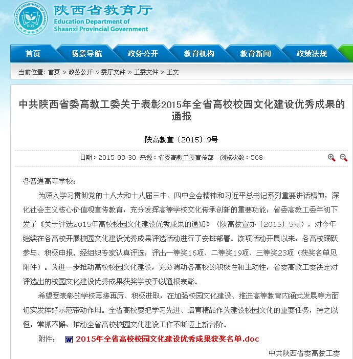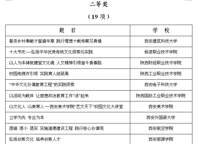 近日,根据省委高教工委《中共陕西省委高教工委关于表彰2015年全省高校校园文化建设优秀成果的通报》(陕高教宣〔2015〕9号),陕西省校园文化建设优秀成果评选结果揭晓,共评出一等奖16项、二等奖19项、三等奖23项。我院宣传教育部申报的《校园传媒作引领 实践育人结硕果》获二等奖,这也是我院连续七年获此奖项。目前我院共有“全国高校校园文化建设优秀成果奖”二等奖1项,“陕西省校园文化建设优秀成果奖”一等奖3项、二等奖4项。