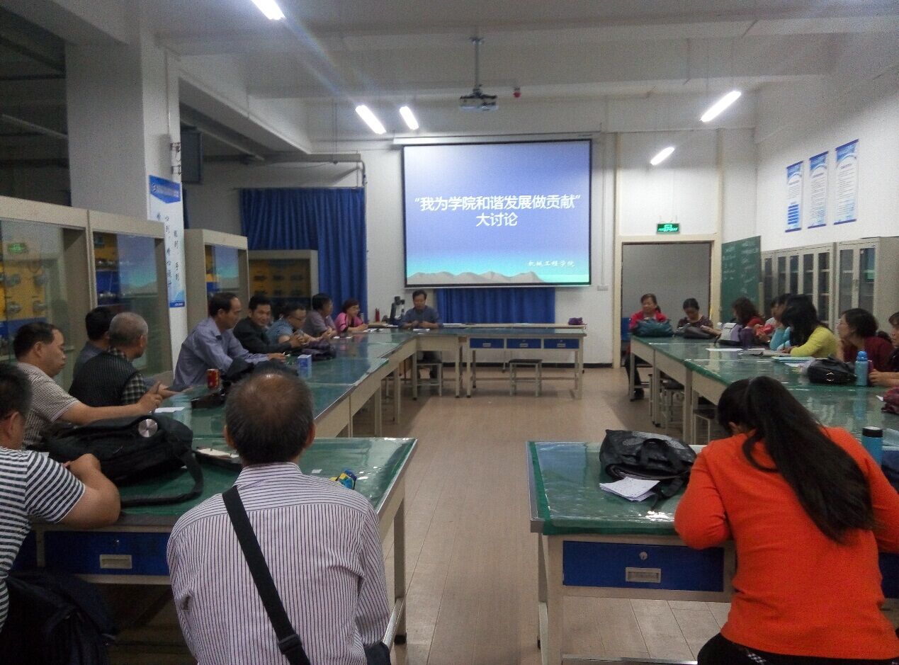 9月22日下午,机械工程学院党总支在行知楼E201机械设计综合实训室举行“我为学院和谐发展做贡献”大讨论活动。活动由机械工程学院党总支书记王金辉主持,该学院全体教职工参加了活动。