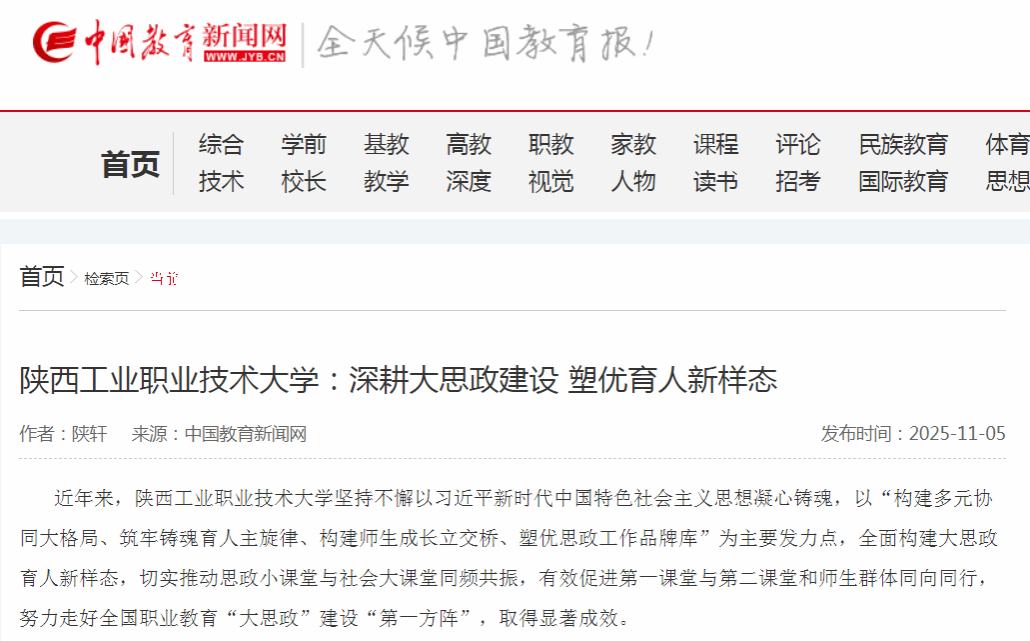 近年来,陕西工业职业技术大学坚持不懈以习近平新时代中国特色社会主义思想凝心铸魂,以“构建多元协同大格局、筑牢铸魂育人主旋律、构建师生成长立交桥、塑优思政工作品牌库”为主要发力点,全面构建大思政育人新样态,切实推动思政小课堂与社会大课堂同频共振,有效促进第一课堂与第二课堂和师生群体同向同行,努力走好全国职业教育“大思政”建设“第一方阵”,取得显著成效。