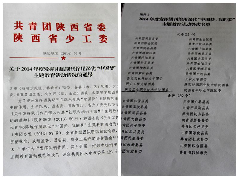 近日,共青团陕西省委、陕西省少工委下发《关于2014年度发挥团属期刊作用深化“中国梦”主题教育活动情况的通报》,我院团委被评为“2014年度发挥团刊作用深化‘中国梦、我的梦’主题教育活动”优秀等次。