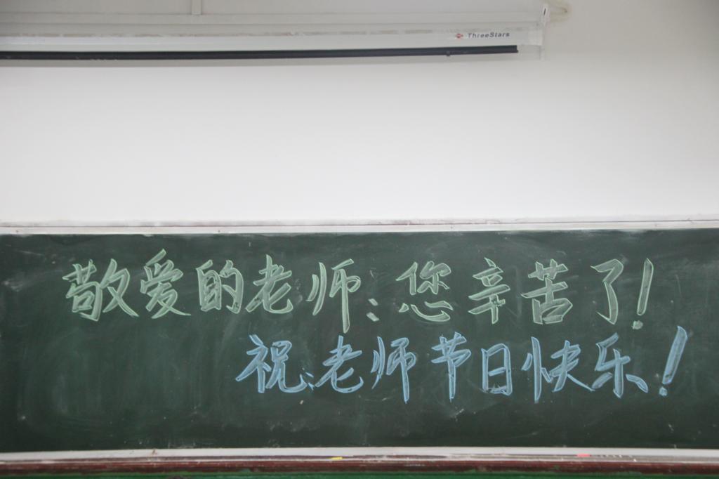 ——温馨祝福遍布教室。在团委的统一安排下,同学们在教师节前一天就开始布置教室。他们把温馨的祝福写在黑板上,让老师在走进教室的一刹那,就能感受到同学们暖暖的祝福。来自化工与纺织学院的王晶晶老师在走进教室的一刻感动地说,这是我收到的教师节的第一份礼物,很特别,也很温馨,非常感谢你们!