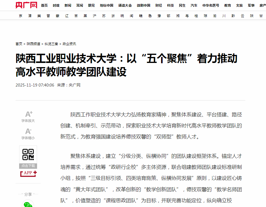 陕西工作职业技术大学大力弘扬教育家精神,聚焦体系建设、平台搭建、路径创建、机制牵引、示范带动,探索职业技术大学培育新时代高水平教师教学团队的新范式,为教育强国建设培养德技双馨的“双师型”教师人才。