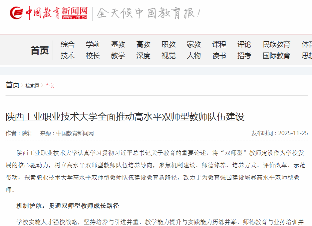 陕西工业职业技术大学认真学习贯彻习近平总书记关于教育的重要论述,将“双师型”教师建设作为学校发展的核心驱动力,树立高水平双师型教师队伍培养导向,聚焦机制建设、师德修养、培养方式、评价改革、示范带动,探索职业技术大学高水平双师型教师队伍建设教育新路径,致力于为教育强国建设培养高水平双师型教师。