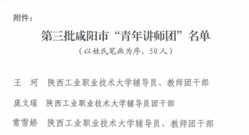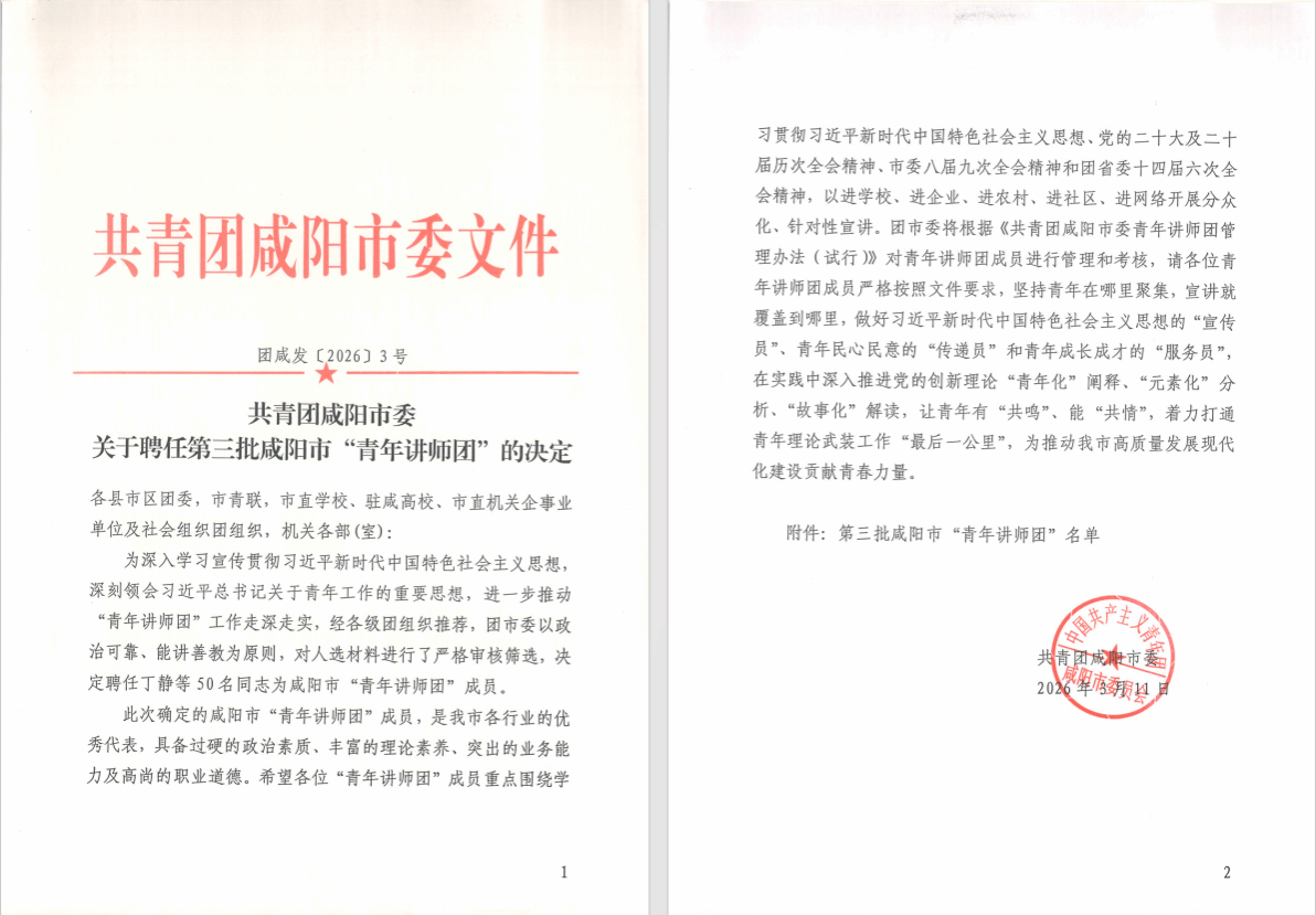 “咸阳市青年讲师团”是由共青团咸阳市委组建的高水平理论宣讲团队,以青年视角阐释党的创新理论,用青年话语传播时代强音。此次聘任以“政治可靠、能讲善教”为核心原则,入选成员均为全市各行业优秀青年代表,具备过硬政治素质、扎实理论素养与突出宣讲能力。根据工作要求,青年讲师团成员将围绕习近平新时代中国特色社会主义思想、党的二十大及二十届历次全会精神等核心内容,深入学校、企业、农村、社区、网络开展分众化、精准化宣讲,做好理论“宣传员”、民意“传递员”、成长“服务员”,推动党的创新理论“青年化”阐释、“故事化”解读。我校三名教师团干部长期深耕学生思想引领、共青团工作与教育教学一线,在理论宣讲、青年服务、校园育人等方面经验丰富、实绩突出。