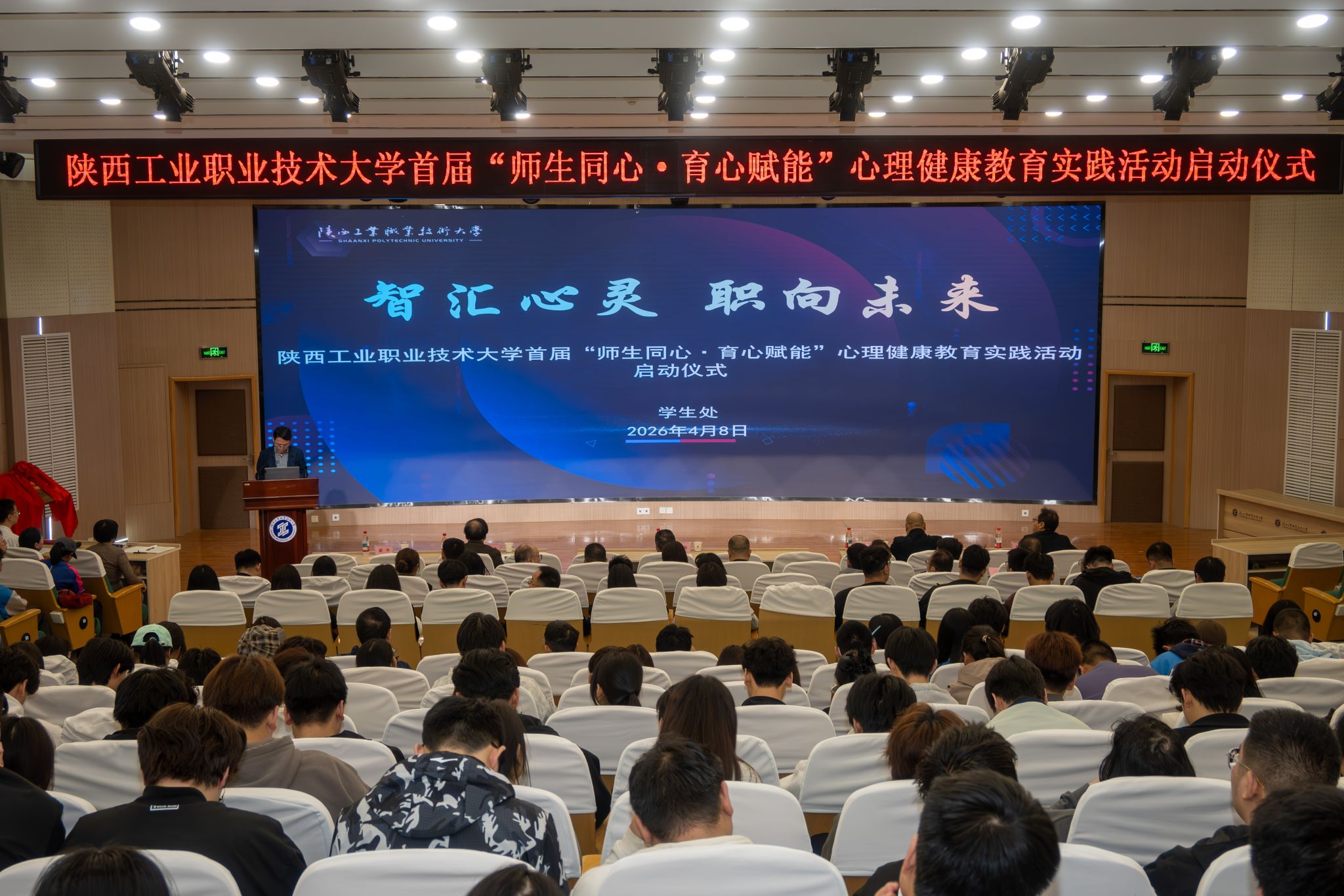 4月8日下午,我校首届“师生同心·育心赋能”心理健康教育实践活动启动仪式在学术会堂举行。本次活动以“智汇心灵·职向未来”为主题,校党委书记惠朝阳、陕西省高校心理素质教育研究会会长郑林科、副校长刘清出席活动。